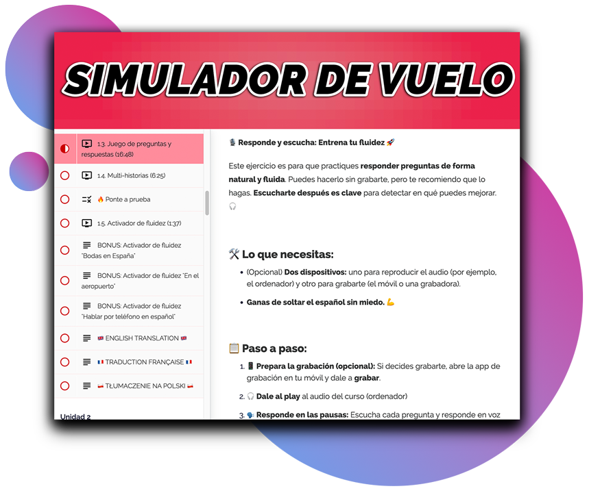 Quiero que experimentes la mecánica del curso, escuches las historias y sientas cómo funciona el simulador antes de realizar ninguna inversión. Es la mejor forma de comprobar si este entrenamiento es lo que necesitas para tu fluidez.
